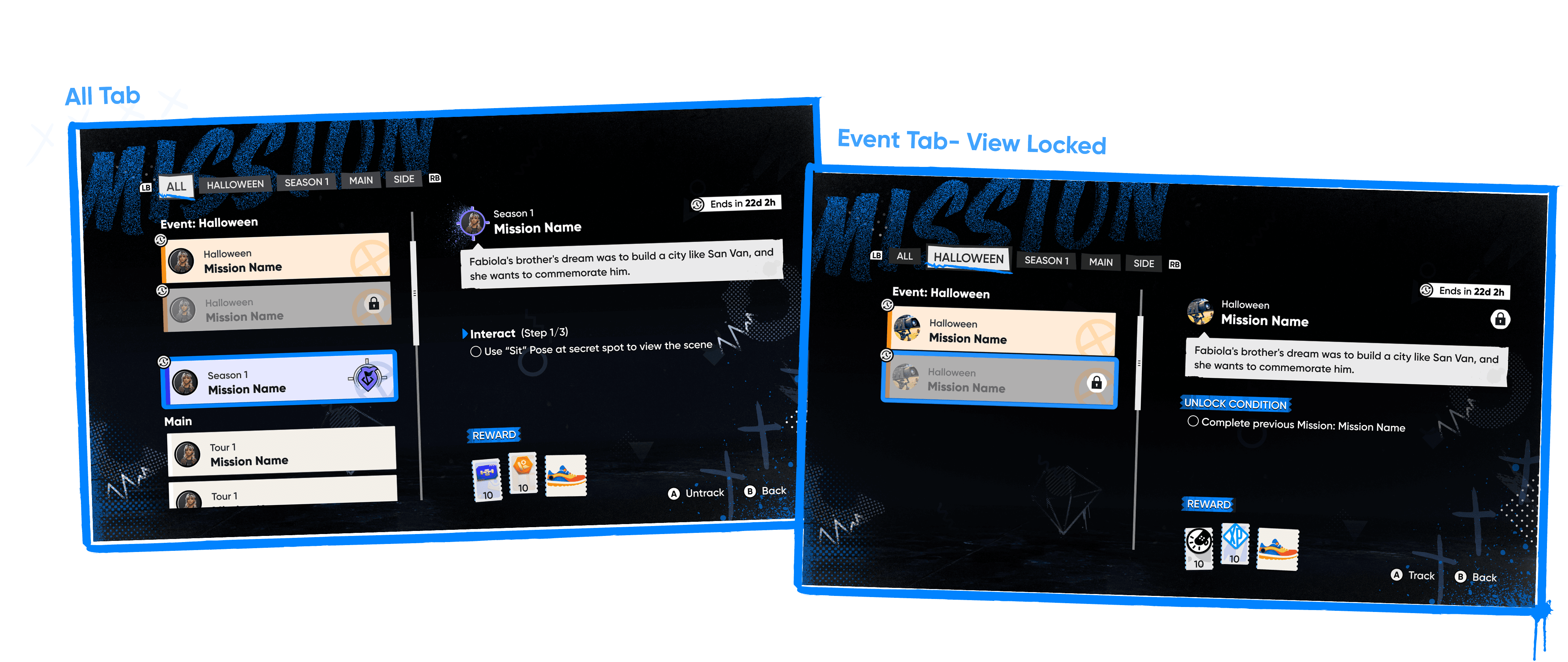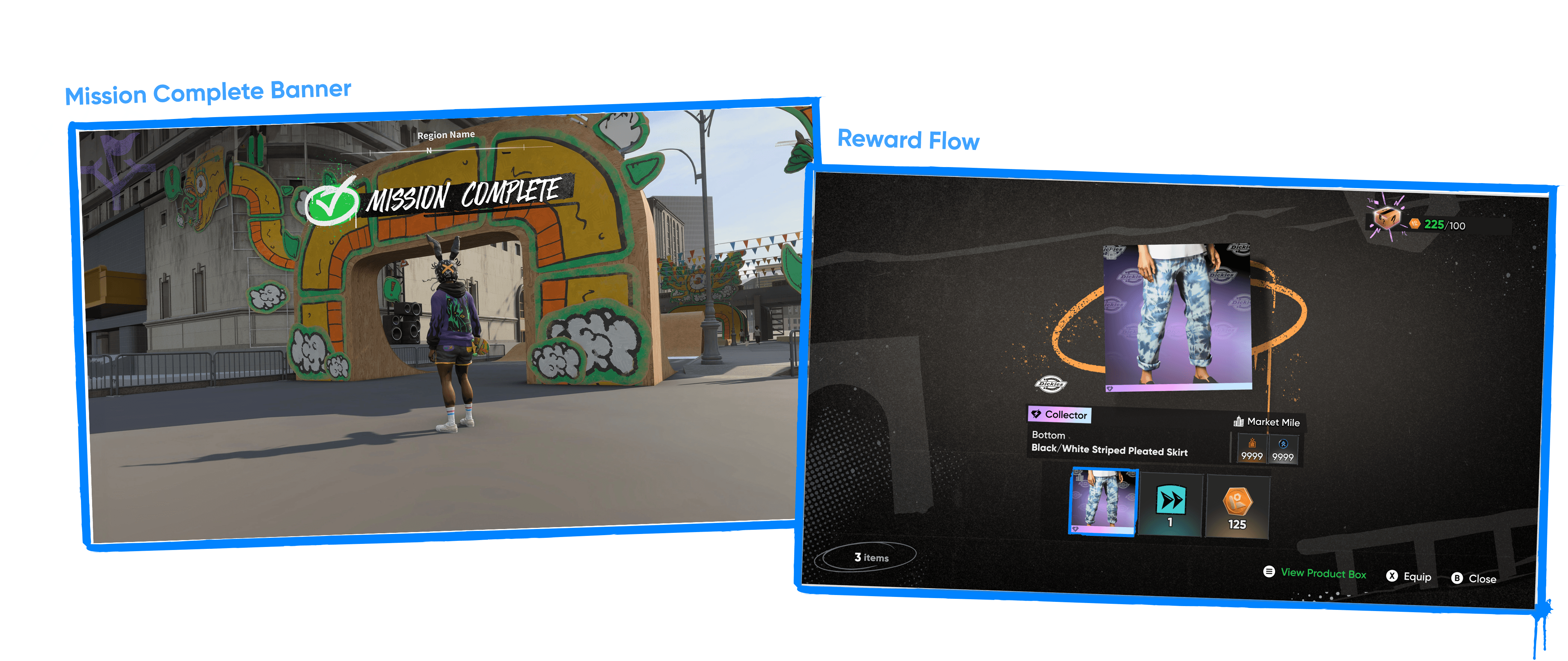 The Mission system acts as the narrative backbone of skate., connecting the main storyline with all core features. As the foundation of onboarding, it introduces players to the world, explains why features exist, and guides them through activities and seasonal events in a cohesive, purposeful flow.