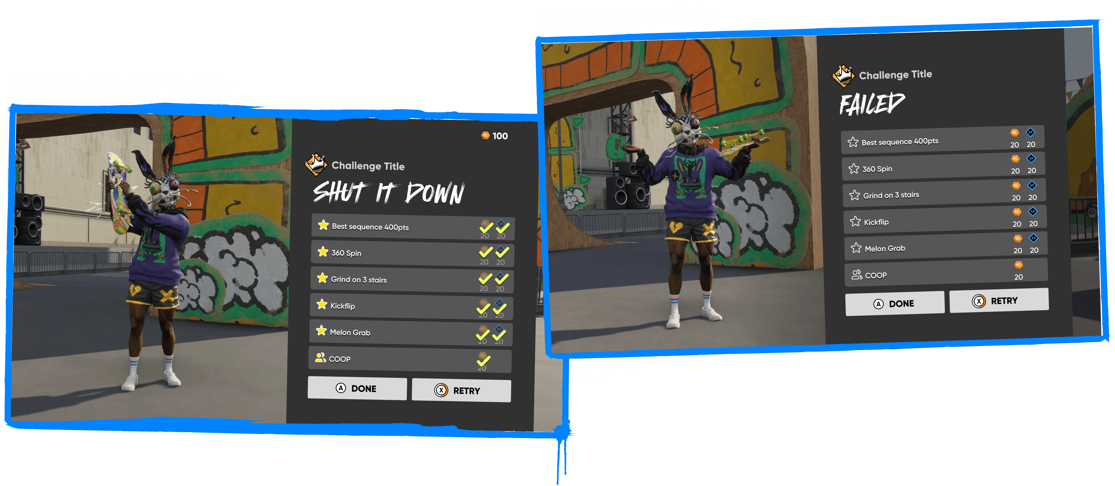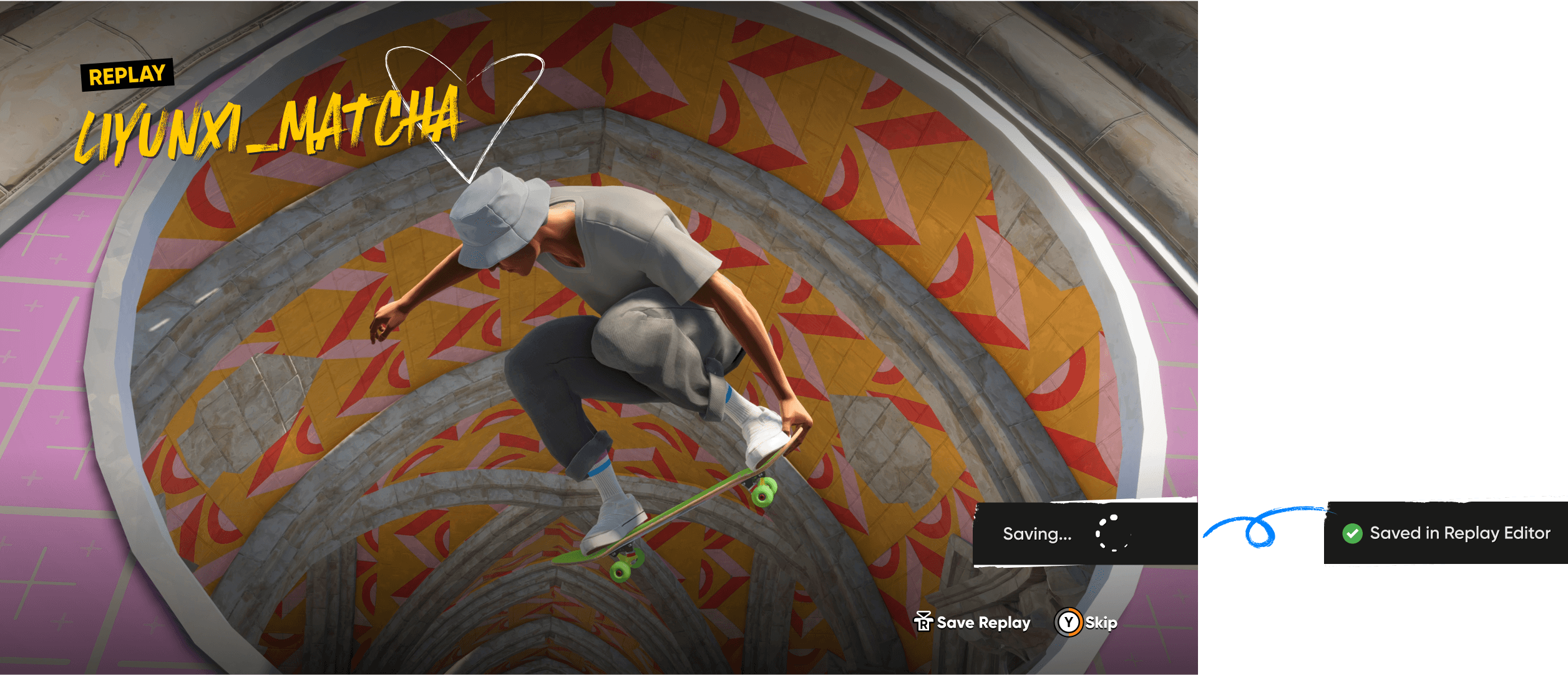 From observing player behavior, we noticed that many players tend to open the replay editor right after completing a challenge or landing a series of cool tricks. Challenge replays often provide cinematic camera angles, enhancing the visual impact of those moments. By having a “Quick Save Replay” button, we enabled players to instantly capture and revisit their highlight moments, making it easier to export and edit them directly within the replay editor.