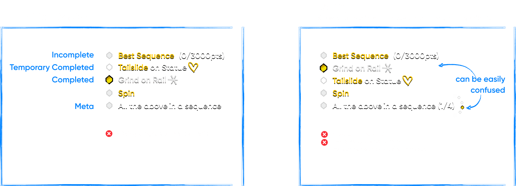 Player can complete a single criteria while requiring to complete all criteria in a sequence. We need to visualize several states