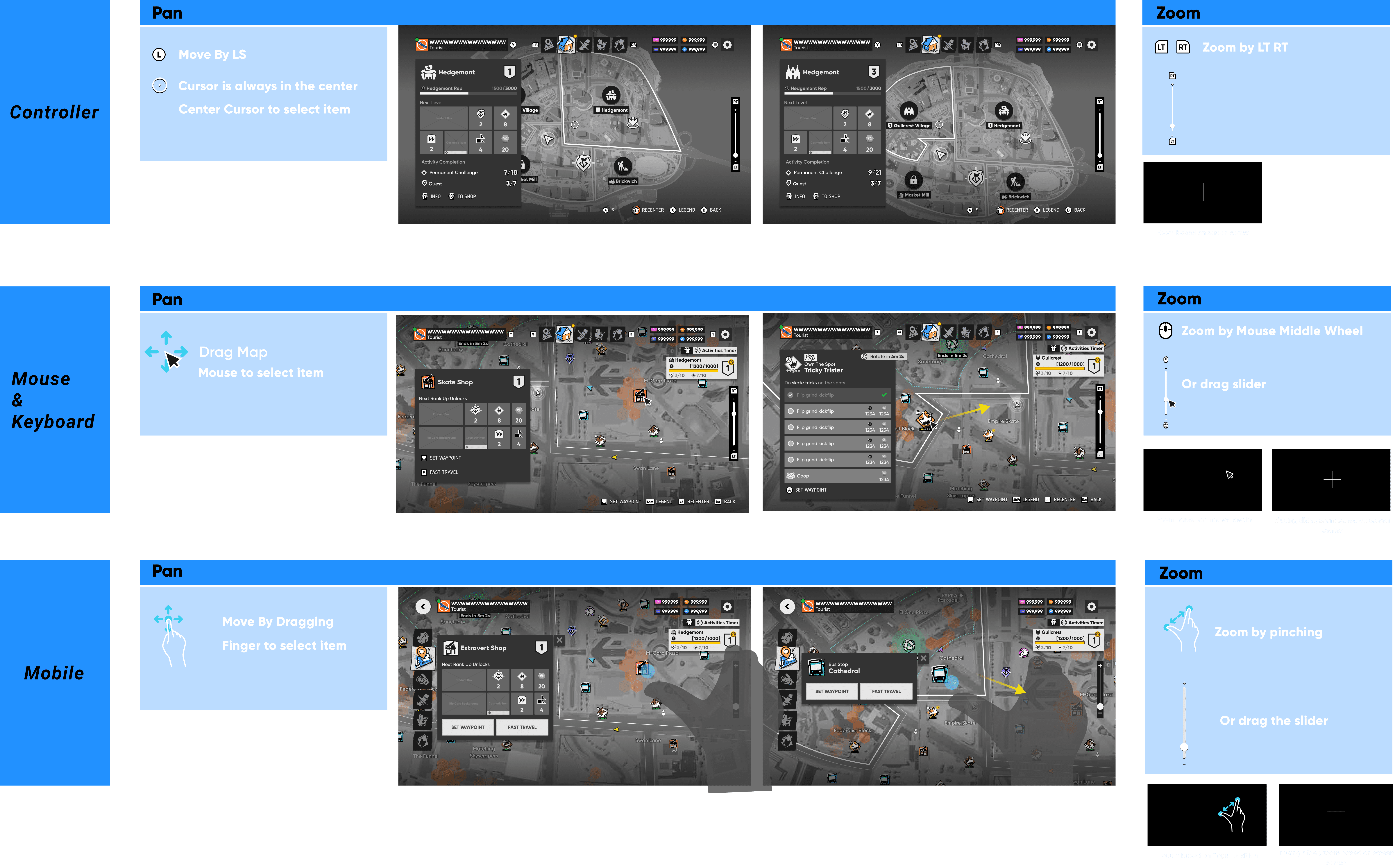 The Map is a core navigation and discovery tool designed around progressive disclosure based on zoom level. The Map is closely tied to player progression, unlocking content and visibility as players advance.